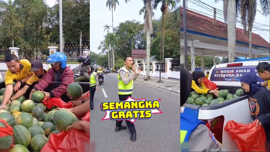 Tepatnya di kawasan Alun-alun Taman Merdeka, aparat dari Direktorat Lalu Lintas Polda Kepulauan Bangka Belitung turun langsung ke jalan—bukan untuk melakukan razia atau penindakan, melainkan membagikan semangka gratis kepada masyarakat yang melintas.